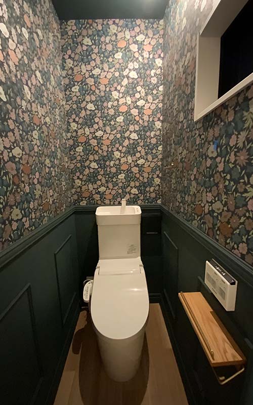 トイレについては、輸入クロスの柄に負けないように、框組を入れて、ボリューム感を演出しました。モールディングにダークカラーを塗装する際は、クラシカルな雰囲気になりやすいため、照明などでバランスをとると良いですね!