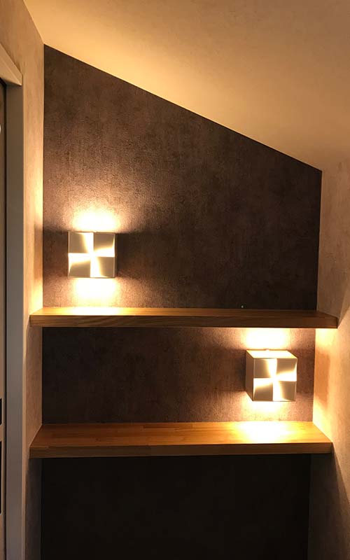 天井の低さと勾配を生かして、控え目な明るさのブラケットライトで教会のようなおごそかな空間に。