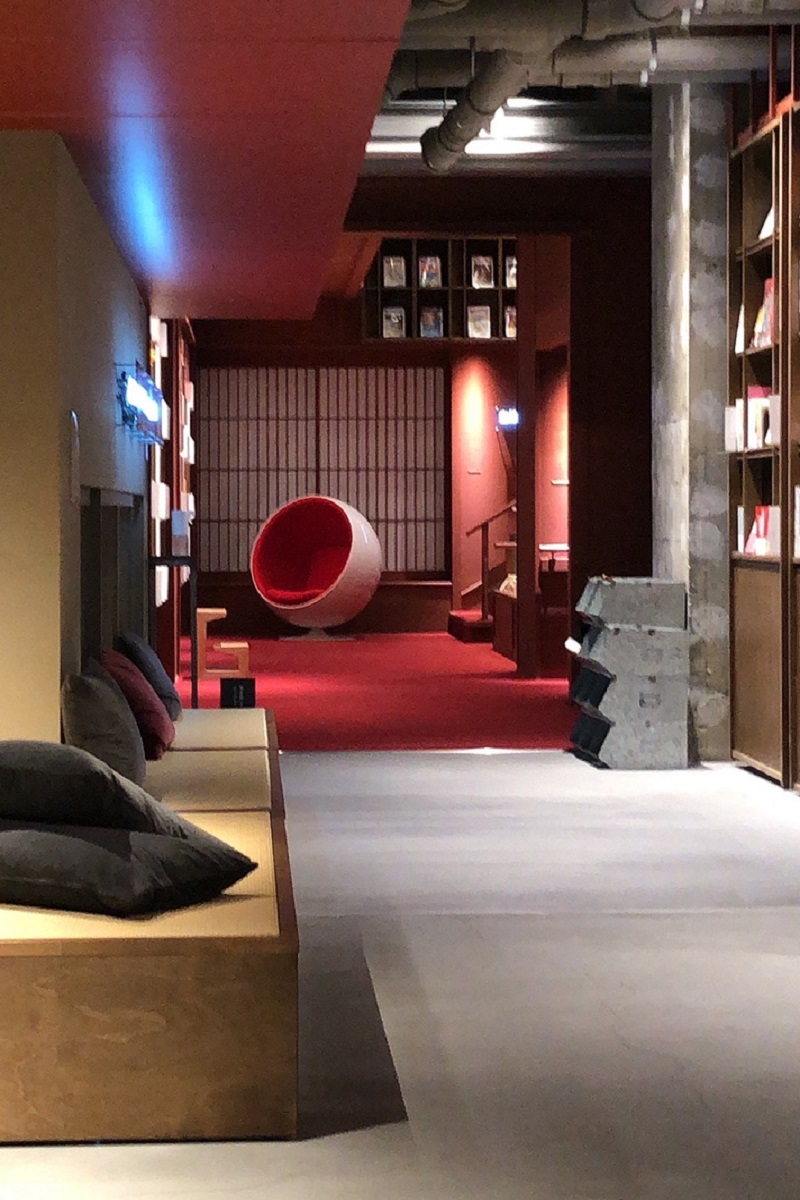 湾曲した木材のデザインに目が奪われます。木目とガラスを多く使った建物は、内藤 廣氏の設計ですが、自然光の取り入れ方が素晴らしいと感じました。
