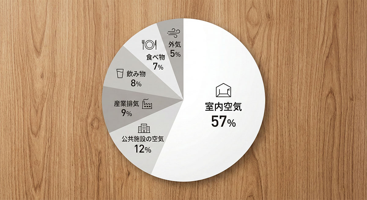 室内空気:57%、公共施設の空気:12%、産業排気:9%、飲み物:8%、食べ物:7%、外気:5%となります。