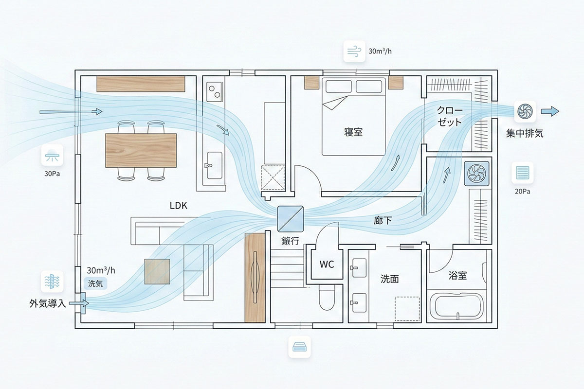 高気密化された住まいでは、自然任せの通風だけでは空気は十分に入れ替わりません。必要換気量を満たすために、給気と排気のバランス、風量、経路を設計段階から明確にし、各室で空気が“よどまない流れ”をつくります。