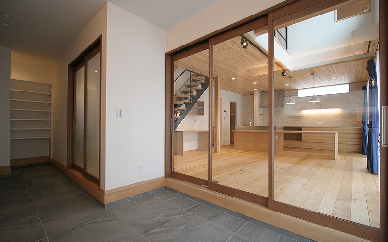 玄関とリビングを大開口の建具でつなぐことで、リビングの一部として使えます。