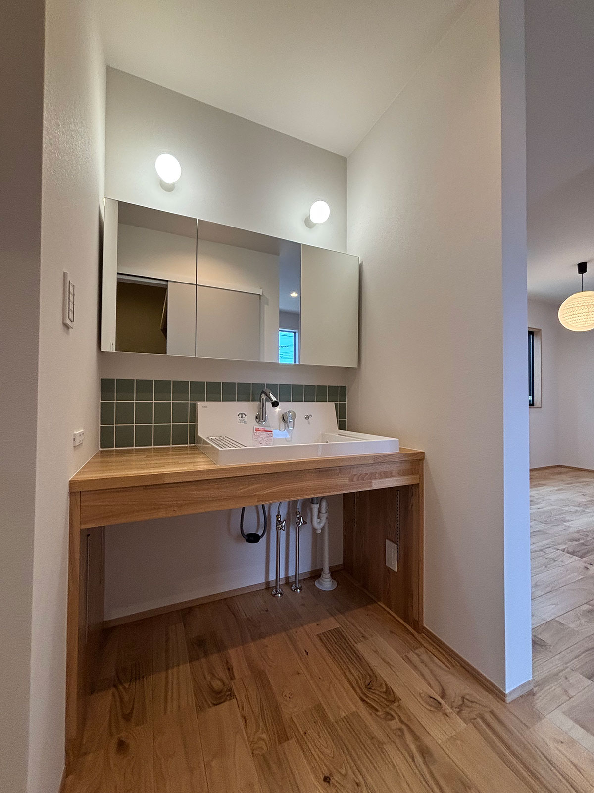 壁面には、やわらかなグリーンのタイルをセレクト。木の質感と調和し、和モダンの雰囲気をより引き立てています。