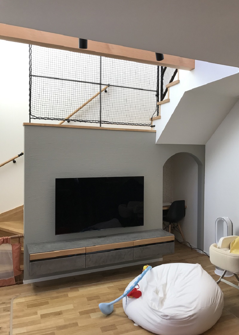 階段の途中に踊り場を設ける事で空間につながりを持たせ、吹抜上部に設けた大きな窓を少し下げてあげる事でリビングに光を取り込んでいます。